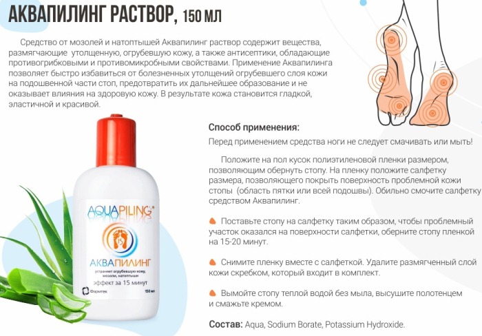 La solution d'aquapilling pour les pieds (les critiques du médicament publiées sur les forums de femmes notent les excellentes propriétés nettoyantes du produit, qui aident à résoudre le problème des callosités chroniques dans les 15 jours) est produite par la société pharmaceutique russe Pharmtek et est un moyen moderne de prendre soin de la peau à problèmes des pieds.