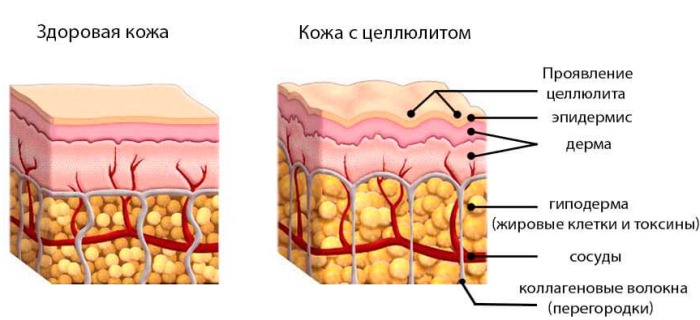 Les dépôts de graisse s'accumulent à un rythme accéléré, absorbant les fluides, les toxines et les déchets. Dans le même temps, les cellules commencent à gonfler et à se gonfler vers l'extérieur sous la forme de tubercules, à mesure que le tissu conjonctif se développe. Chez 80 à 95% des femmes, la cellulite se produit, chez les hommes - dans des cas isolés.