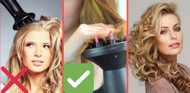 - Boucles de diffuseur - Il est facile de faire des boucles à partir de cheveux ondulés de longueur moyenne en se lavant la tête puis en se rinçant les cheveux à l'eau froide. Ensuite, ils sont essuyés avec une serviette et traités avec une quantité de mousse qui tient dans la paume de votre main, répartie avec un peigne à des intervalles de l'espace entre les dents. Les cheveux sont séchés avec un séchoir diffuseur en cercle, après quoi ils sont vaporisés de vernis.