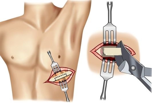 Avec la méthode ouverte, le patient est injecté dans un sommeil médicamenteux profond. Après avoir disséqué la peau et la couche musculaire au niveau de la 8e côte à partir du dos, le chirurgien coupe le périoste en plusieurs endroits. Si des signes de nécrose et de suppuration sont détectés, un petit fragment est retiré, un tube de drainage est installé pour éliminer l'exsudat purulent.